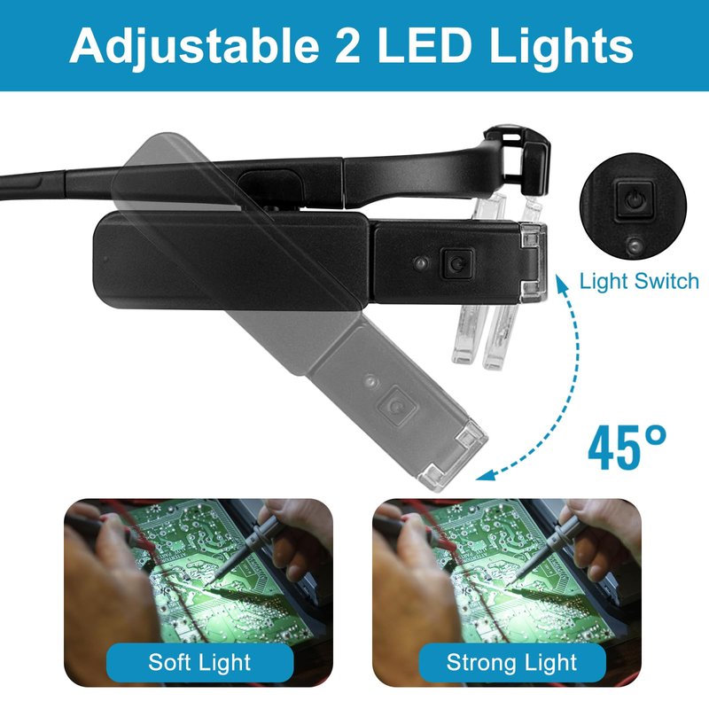 - 3 LENSES & 6 MAGNIFICATIONS: There are two lens slots in the head mount magnifier. You can insert one or two different magnifying lenses into the slot at a time. The headband magnifier has 3 replaceable magnifiers including 1.5x, 2.0x, 2.5x. Higher magnification can be created by combining two lenses together. (3.5x, 4.0x, 4.5x).