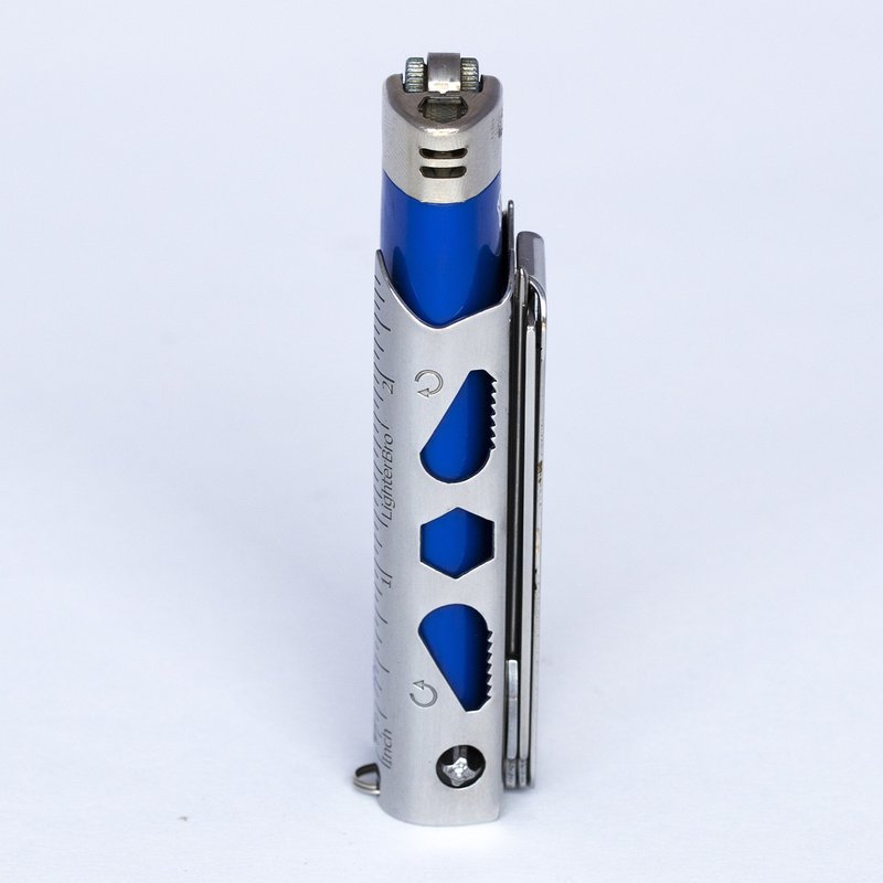 - LIGHTER SLEEVE & MULTI-TOOL: The LighterBro Pro Lighter Sleeve is no ordinary lighter sleeve. It comes with a standard and metric ruler, 1/4 inch drive socket, #3 Phillips bit, 3/16 and 5/16 sockets, wing nut wrench, two nut grabber wrenches, and an attachment point for lanyards or carabiners. It conveniently Fits BiC lighters and Clipper lighters (not included), is sleek, pocket-friendly, and easy to carry.