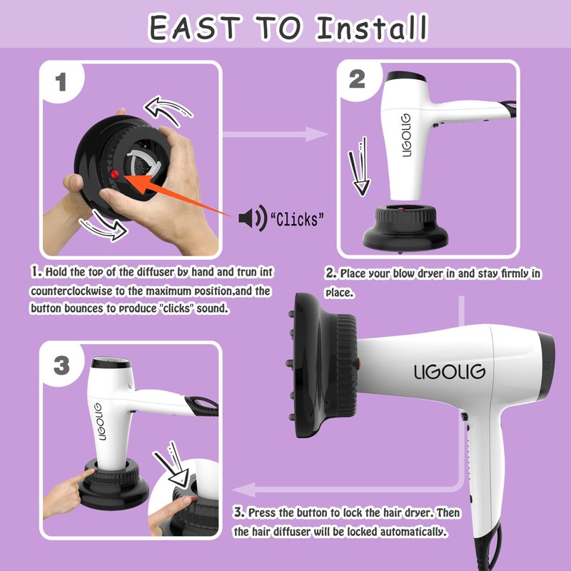 - Ligolig diffuser hair dryer effectively reduces frizz, adds volume, defines wavy curls, and enhances the overall texture of your hair. only Twist the top of hair dryer diffuser attachment counterclockwise to enlarge the opening, slip dryer nozzle into hair diffuser and release.Unlock the full potential of your locks with our game-changing hair diffuser. Show off your gorgeous, bouncy curls with utmost confidence and flair.