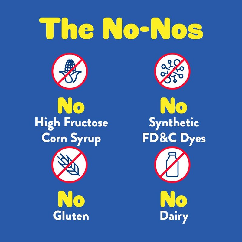 - Contains no high-fructose corn syrup, no synthetic (FD&C) dyes, no dairy and no gluten.