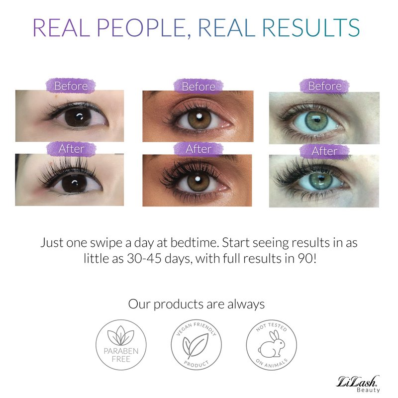 LiLash Purified Eyelash Serum conditions and nourishes lash follicles to boost the appearance of length, thickness and curl of your lashes, so you can be your best, authentic self. Just one swipe a day at bedtime and you'll soon experience the magic of LiLash. Start seeing changes in as little as 30-45 days with full changes in 90. LiLash is physician formulated, and safe for sensitive eyes and contact lens wearers. Never tested on animals and paraben-free
