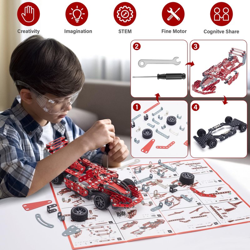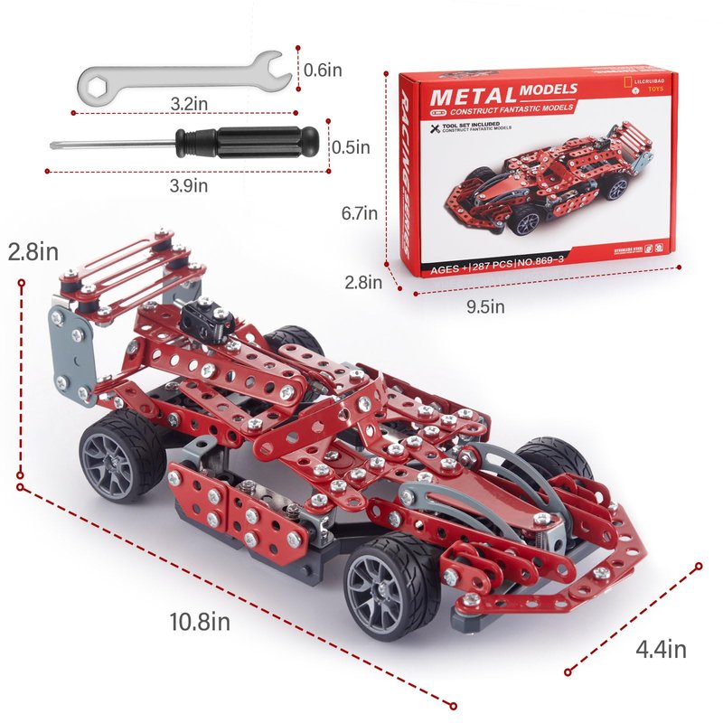 STEM Building Toys For Kids Ages 8-12 Our model car building toy is designed for 8+ years old kids, includes 287 parts, such as nuts, bolts, screwdrivers, and wrenches, made of durable metal. After the build is completed, the tail can adjustable freely, and the car can slide for a long distance with a little push. This stem building toy incorporates boring engineering knowledge and concepts into funny building games, aiming to improve children's STEM skills.Easy To Follow Instructions We have prepared clear instructions for children, each step is illustrated, step-by-step instructions that are easy to understand. This teaches them to follow instructions and ensures they won't become overwhelmed or frustrated while they build. Wrenches and screwdrivers are also prepared for children to assemble parts easily.Hands-On STEM Learning Toys Children need to build this model car through careful thinking and patience. Children always have infinite creativity! We believe that STEM science education can greatly promote creative learning and brain development.Metal Made & Bigger Size.model car building toy is made of metal and the model car is sturdy once built without worrying about loosening. With a size is 2.8''H× 10.8''L×4.4''W,. It is become a beautiful display to decorate your desk, office, home, display case. It will definitely become an indispensable model car in the build series.Suitable For Giving Our model car stem building projects set choose stronger, high-quality materials, fine and gentle surface treatment, 100% friendly and no hurt kids, to ensure the safety of your kids, and at the same time have a long-lasting play and construction durability. A great toy for 8 9 10 11 12 13 14 15 16 year old boys and girls. As a stem science education project birthday, give your teenager or student a big surprise.