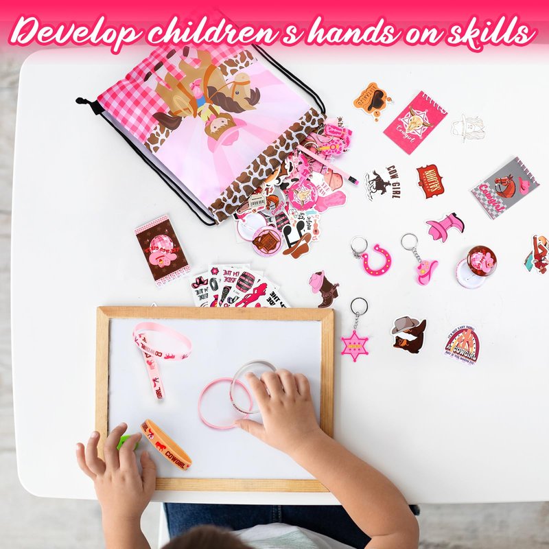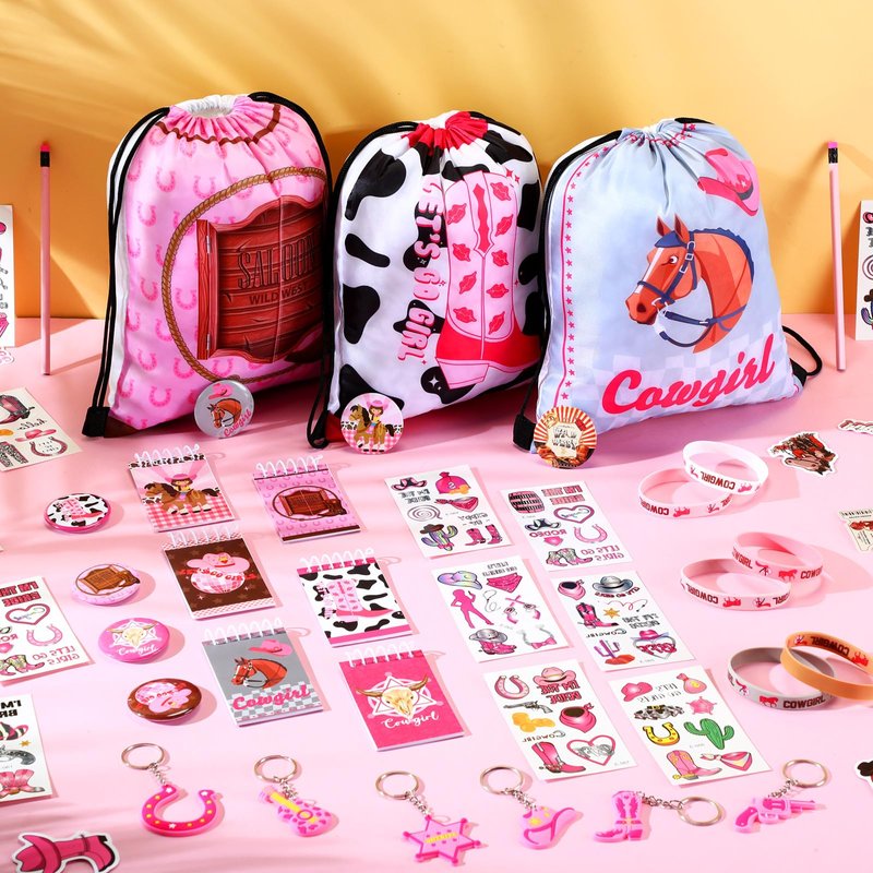 - All Encompassing Pink Cowgirl Party Supplies: this set encompasses an incredible 140 piece bulk pack of pink cowgirl party favors, inclusive of 12 pink cowgirl drawstring backpacks, 12 pink cowgirl silicone bracelets, 18 pink cowgirl books, 12 pink cowgirl badges, 12 pink cowgirl silicone keychains, 12 pink pencils, 1 set 50 pcs pink horse stickers, 12 x pink tattoo stickers; This abundant diversity ensures to meet all your party decoration and gift giving needs