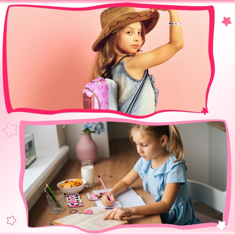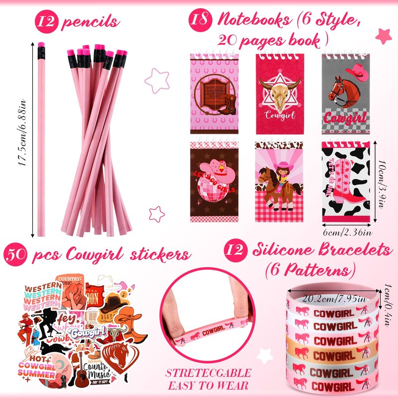 - Educational Interactive Element: not only being an ideal party favor, these pink cowgirl themed party supplies also double up as educational learning materials; The notebooks and flexible pencils inspire to explore their creative abilities and hone their writing skills; The pink cowgirl themed stickers encourage problem solving and imagination, enhancing hand eye coordination, cooperative abilities, thinking capacity, and imagination
