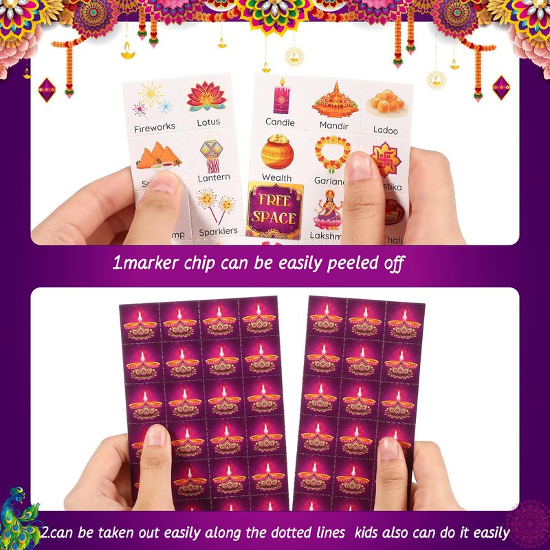 - Diwali Party Games: our Diwali games set includes 24 bingo player cards (24 different patterns per card), 10 sheets of marking chips (56 pieces of chips per card), 1 calling card; The Diwali bingo is ideal for Indian New Year party games
