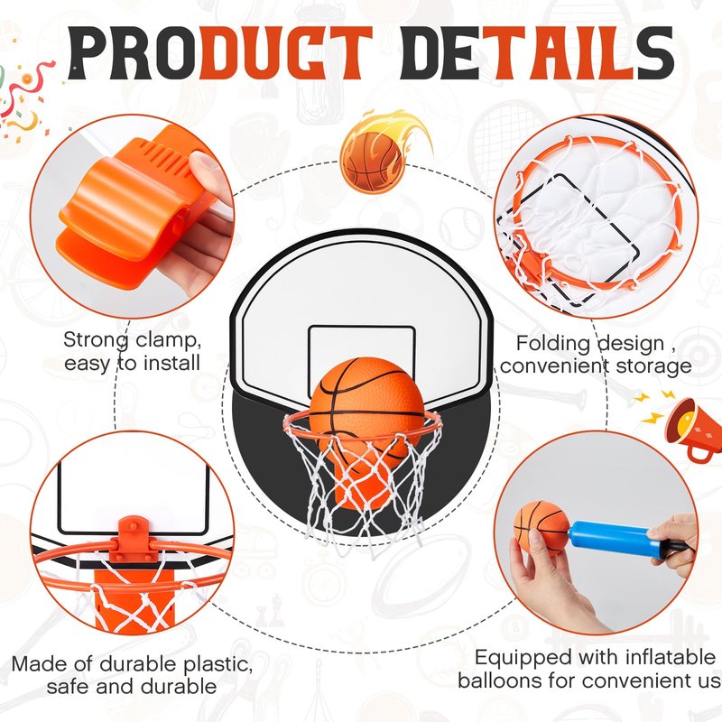 Features: This indoor basketball hoop set transforms a regular activity into an enjoyable pastime, enabling you to practice your skills and compete with friends. It's not just a functional piece but also fosters interaction. Apart from being a office game set for adults, it also serves as an impressive decoration, adding a playful touch to a room. Its concept integrates sport and design, adding an interesting and active vibe in your living space. Specifications: Main material: plasticColor: as picture showSize: Ball hoops: about 9 x 10.2 inches/ 23 x 26 cmInflatable basketballs: about 3.1 inches/ 8 cm in diameterPackage includes: 4 x Clip on basketballs hoops with backboards 4 x Inflatable basketballs 2 x Air pumpsNotes: Manual measurement, please allow slight errors on size. The color may exist a slight difference due to different screen displays.