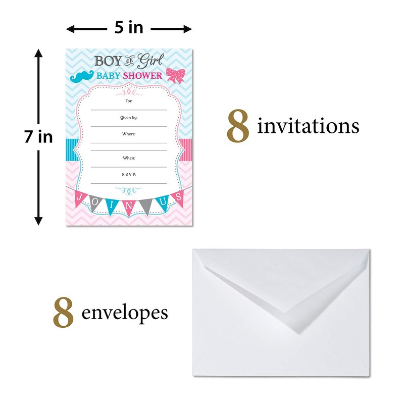 Lillian Rose 8-Piece Baby Gender Reveal Invitations, Pink/Blue/White, 5" x 7"
