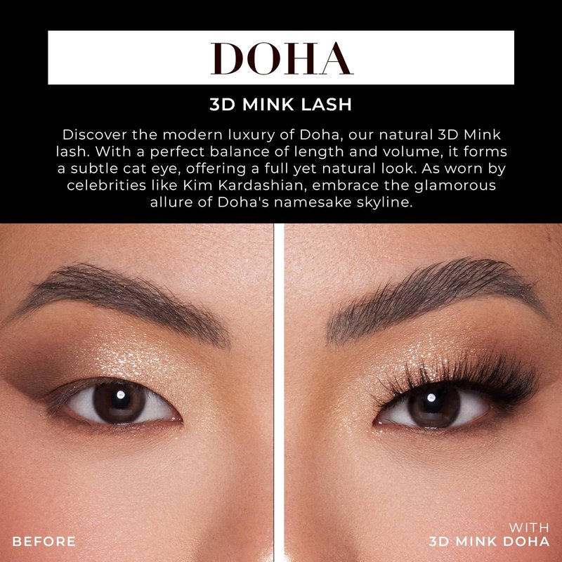 Doha is our most natural 3D Mink Lash. It's flare lash design adds just the right amount of length and volume that gradually increases from the inner eye to the outer edge for a flirty cat eye finish. Adds the perfect amount of length and evenly distributed volume for a fuller lash. These mink 3d individual lashes add length and a chic look to any outfit. Wear these natural fakes eyelashes for a night out on the town or a concert. Doha wispy lashes natural look are perfect for any occasion. These 3d mink individual eyelashes are long lashes for a dramatic look. Looking for 3D lashes Mink look no further these are strip lashes that look like extensions made out of real mink. At 15 mm in length are a more natural lash, and considered to be short natural lashes . Our lash extension strip eyelashes were worn by many red carpet celebrities including kim kardashian lashes. We have a wide variety of lashes and you can buy these eye lashes sets pack by combining them with other lashes in our collection. This Mink lash will not disappoint. They are short natural lashes, fox eye eyelashes with a false lash natural look. How to apply lashes look at our how to video for guidance. These short mink eyelashes are natural thick lashes. While they are Fake lashes natural look they also are flutter lashes. 3d mink false eyelashes are great for elevating the eye and bringing it more attention. Short mink lashes natural look that are lashes mink natural look wispy and falses eyelashes natural