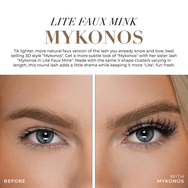 TA lighter, more natural faux version of the lash you already know and love, best selling 3D style "Mykonos". Get a more subtle look of "Mykonos" with her sister lash "Mykonos in Lite Faux Mink". Made with the same V shape clusters varying in length, this round lash adds a little drama while keeping it more "Lite", fun fresh.