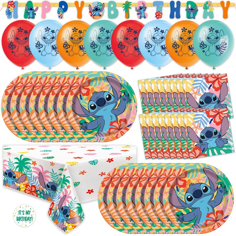 - INCLUDES: This Lilo and Stitch party decorations set includes: 1 "Happy Birthday" banner, 1 tablecover, 8 balloons, 16 large 9" paper Stitch plates,16 Stitch napkins, and 1 "It's My Birthday" sticker.