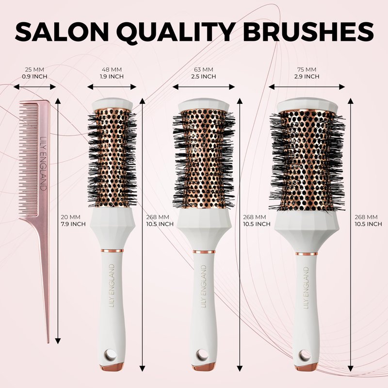 Introducing the Lily England Round Hair Brush Set, the hair care gift set for every woman who loves to style her hair effortlessly. This professional hair brush set includes 3 varying size round brushes and a comb, providing you with all the tools you need for a flawless blow dry. Whether you have short, medium, or long hair, this 4 piece kit has got you covered! Our round barrel brushes are designed for blow drying, allowing you to achieve salon-quality results from the comfort of your own home. The barrel brush for blow drying is perfect for creating volume and body, while the big barrel brush is ideal for smoothing and straightening. With the barrel hairbrush, you can style your hair, leaving it looking sleek and full of life. Not sure what to gift the women who has everything? Look no further! Our hairbrushes for women makes for a thoughtful gift. Whether it's for a birthday, anniversary, or just to show someone you care, this set is sure to impress. It's also the perfect addition to any beauty gifts sets for women, making it an ideal womens gift set and teen girl gift. With Christmas just around the corner, our Round Hair Brush Set is one of the best gifts you can give to the women in their 30s. It's a practical yet luxurious gift that will make their hair styling routine a breeze. Treat your loved ones to this exquisite women gift set and watch their faces light up with joy. Don't miss out on the opportunity to make this Christmas truly special! In conclusion, the Lily England Round Hair Brush Set is the ultimate hair care gift set that every woman needs in her life. With its professional quality brushes and comb, it's the perfect tool for achieving salon-worthy hair at home. Whether you're looking for a unique gift for women who have everything or searching for the best gifts for women in their 30s, this set is a must-have. Don't wait any longer, get your hands on this amazing hair brushes and experience the transformation in your styling routine today!