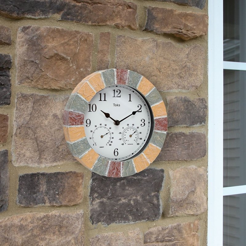 Lily's Home Hanging Wall Clock, Includes a Thermometer and Hygrometer and is Ideal for Indoor and Outdoor Use, Faux-Stone (10 Inches)