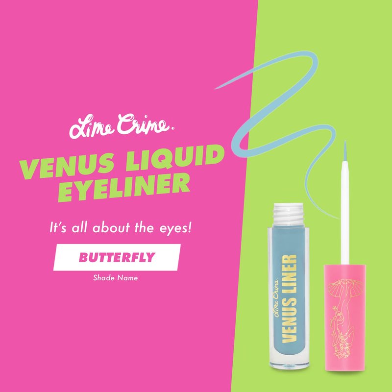 - Butterfly Venus Liquid Eyeliner: It’s all about the eyes! Lime Crime’s Venus Liquid Eyeliners are art-forward and bound to boost any mood with color vibrancy. The shade Butterfly is a bright aqua that will help transform you into a true artist!