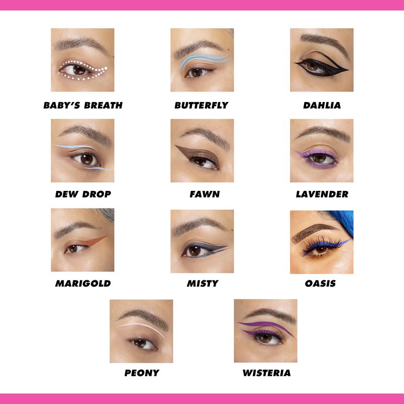 Shake before using Venus pigmented liquid eyeliner. Use pigmented liquid liner’s fine brush tip to shape the eye. Apply formula in thin layers and let dry. Create thin wings, thicker mega wings, or layer on multiple pigmented liquid eyeliner shades for a colorful masterpiece. To steal the eye-scene, use and Aura Face & Eye palettes shades before pigmented liquid eyeliner application. Glory