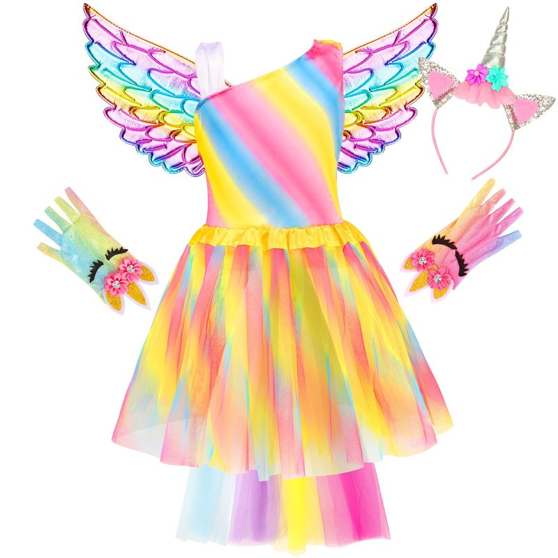 - Kids' Dress up pretend role play costume set are made of premium polyester. Tops with Velcro closure for easily put on and take off, skirts with stretchy elastic waist. Rainbow unicorn skirt designed detachable colorful tail, other princess costume accessories are excellent in workmanship and have smooth edges. Everything protect girls delicate skin.