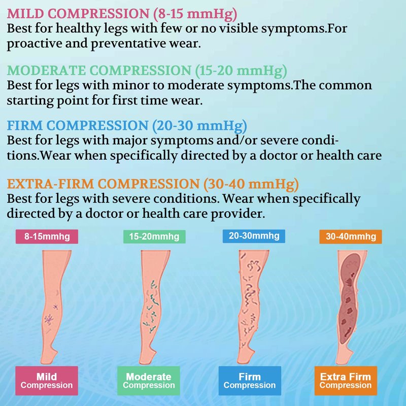 - Graduated compression technology is greatest at the ankle (15-20mmHg) and decreases gradually up the leg to improve healthy circulation.
