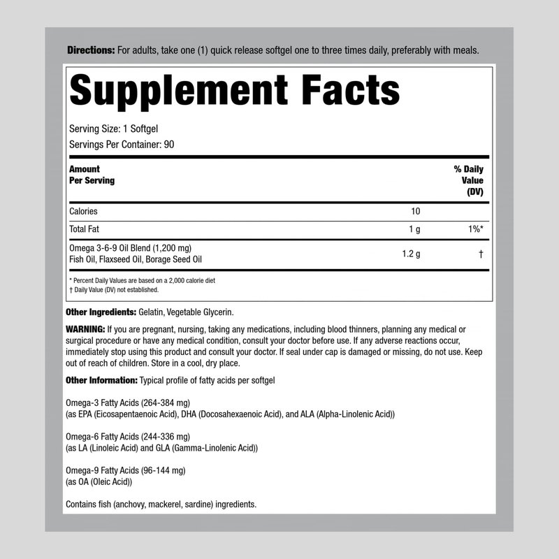 Omega 3-6-9 provides a popular blend of essential fatty acids. They play an important role in heart, skin, joint, immune, cell membrane and nerve health.* It's made with cold-pressed flaxseed oil, purified molecularly-distilled fish oil, and borage oil.