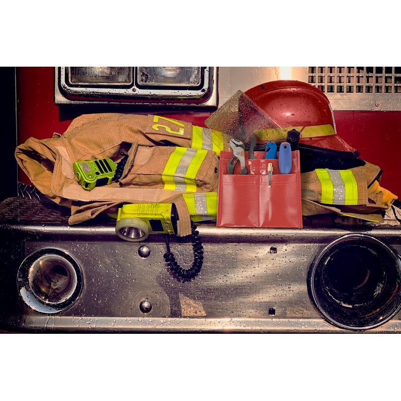 The tool pouch is designed to hold a variety of personal tools from Wedges to Pliers to Screwdrivers. It slides easily into your turnout coat or pants pocket. Tools not included!!! Measures: 8″W x 7 1/4″H. Prevents rips and tears in bunker-turnout jackets and pants. Color: Red "Tools, Fire Helmet and Jacket are NOT included. "