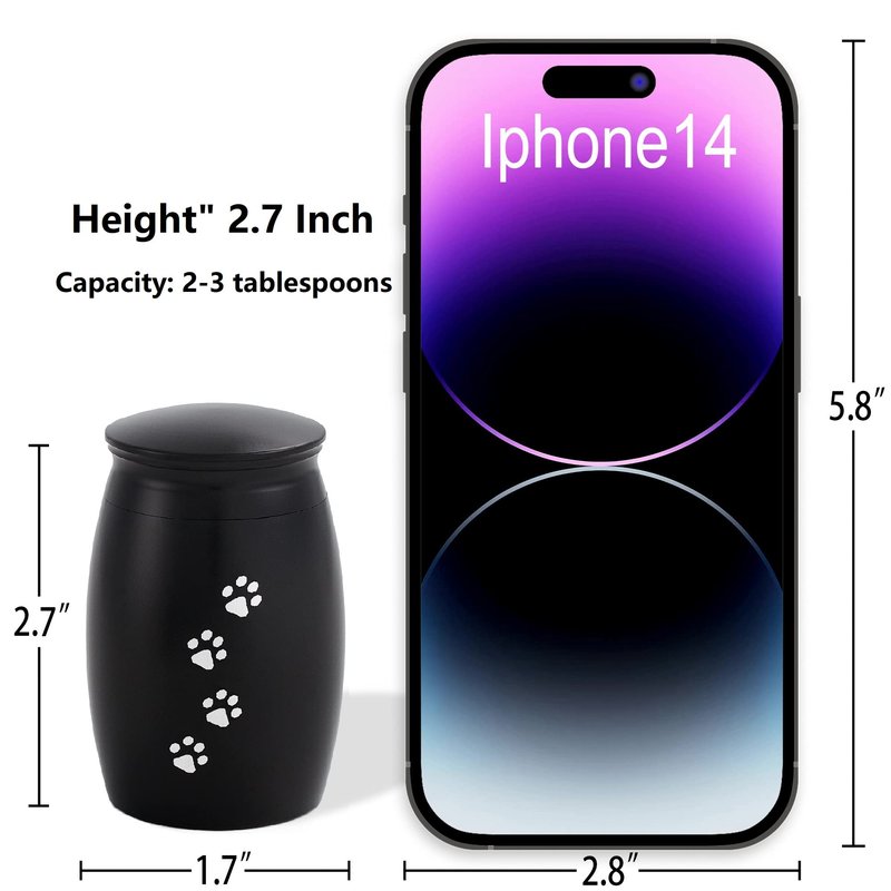 - Small pet urn size: 2.7 inch tall, and the diameter is around 1.7 inches, which can hold about 2-3 tablespoons pet urns ashes.