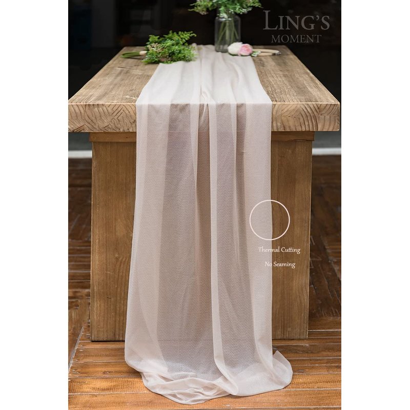 - Unique wrinkle-resistant fabric makes this table runner READY TO GO. Two ribbon ties are included for gathering soft luminous folds looking at both ends. Or you may just let it drapes gracefully across your table and flows onto the floor in dreamy pools of fabric.
