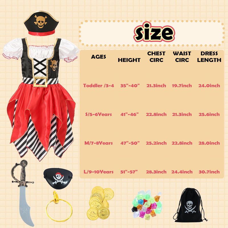 - VALUABLE CONTENTS--This girls princess pirate costume set including an adorable pirate dress,a pirate hat,a sword,an eye-patch,a pirate pouch containing 10pcs pirate coins and 20pcs big gems,a gold earring,providing so much fun for kids role playing.