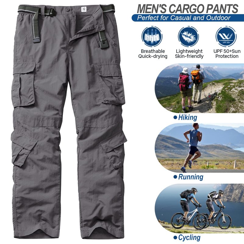 QUICK DRY & UV PROTECTION: Quick-Dry moisture transport technology transfer sweat from the skin to the fabric in which it transmit across the surface to rapidly evaporate, help pull moisture away to keep you cool and dry. The outdoor lightweight pants feature UPF 50+ fabric, the tight weave construction cloth with UV absorbent yarns blocks UV rays to help reduces your exposure to harmful UVA/UVB radiation, prevent sunburn and skin damage. ADJUSTABLE & DURABLE: These Men's cargo pants are built with elastic waist, relaxed seat and thigh, allows the pants to fit comfortably while you are active or sitting. The gusseted crotch and articulated knees combine with the ripstop polyester fabric, ensure maximum freedom of movement and ultimate comfortability outdoors. Extra Teflon Coating on the hiking pants surface effectively resist water, oil and stain. Hiking Pants Mens: Comfort fit part elastic waist for many body types,water repellent, wear-resisting,this outdoor hiking pants features a classic cargo silhouette with straight leg design for comfortable and loose, which can adapt to the big movements without tearing. Partial elastic waistband with belt loops, additional detachable webbing belt with buckle for customized personal fit. Quality SBS zipper closure and metal button provide the hiking pants max durability and security. For Outdoor or Daily wear: The men's hiking cargo pants crafted for a relaxed fit, multiple color options make them suitable for various occasions. Suitable for all kinds of daily wear and outdoor sports: outdoor hiking, camping, fishing, running, hunting, cycling, mountain climbing, travel, work, jogging, climbing.