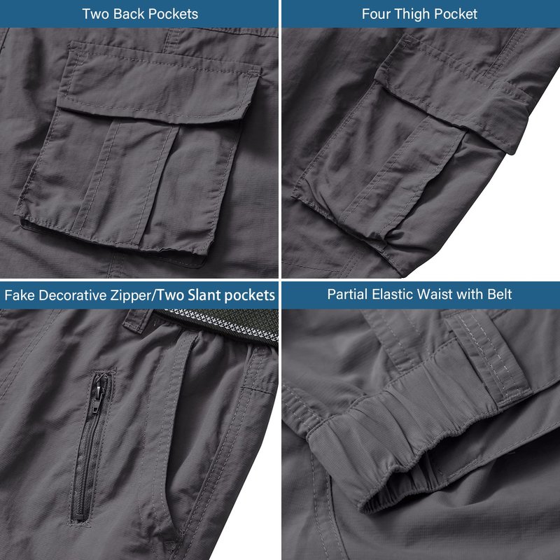 - Fishing/Camping Pants Men: This nylon cargo pants are with side elastic waist for maximum comforts and 8 pockets for your belongings safety - Slant pockets x 2, Rear pockets x 2, Thigh cargo pockets x 2, Leg pockets x2.