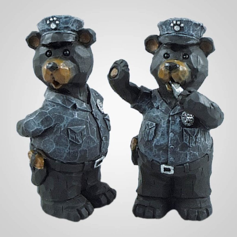 - Faux carved-wood bears. Both are wearing a police hat and attire with a silver bear paw on the front of the hat and bear paw badge above the shirt pocket plus a holster with a pistol