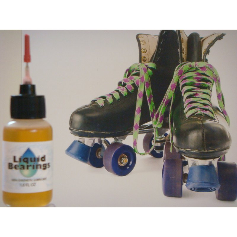 This is the synthetic lubricant that consistently outperforms all others currently available. It has incredible low and high-temperature characteristics, which is absolutely necessary for proper skate lubrication but completely lacking in petroleum-based oils and sprays like silicone. Don't use them on your skates any longer! Actual oils and lubricant sprays leave sticky deposits when they evaporate over time. Real oil is made up of a mixture of long and short chains of carbon and hydrogen atoms, and under certain conditions the short-chain molecules evaporate, and the unstable molecules oxidize and break down. This leaves a sticky residue which can actually "gum up" the device it was intending to lubricate. Conventional oils also contain impurities such as sulfur, waxes, and unstable hydrocarbons which are left behind as residue deposits. In contrast, synthetic oils are made using a process that re-arranges the structure so all the molecules are uniform in size, shape, and weight, an ideal phenomenon which does not occur in nature. Synthetics are custom-designed to produce the ultimate lubricant, with inherent performance characteristics vastly superior to any petro-oil. Liquid Bearings is also essentially odorless, so your hands and clothes won't smell like oil after using it. It is perfectly safe to begin using Liquid Bearings on all your skates immediately, even if you have been lubricating them with conventional oils for years. It is fully compatible with all vintage and current oils, and will eventually flush away the residue of the evaporated real oil over time. You will easily notice that your skate wheel bearings will move more freely and quieter with Liquid Bearings, especially if you have been using petroleum-based oil on them. It is completely plastic-safe, and will not harm painted surfaces. The bottle is top-quality LDPE, and the stainless needle allows the application drop-by-drop.