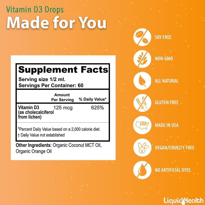 - BOOST MOOD, IMMUNITY, BONE HEALTH, SKIN HEALTH & MORE: Liquid Health's Vegan Vitamin D3 Drops with 5000 IU are made with pure, plant based D3 from naturally occurring plant species Lichen, Organic MCT oil, and Organic Orange oil. These high potency drops are essential for maintaining healthy bones and teeth, healthy skin, boosting immune system function, and improving overall wellness.