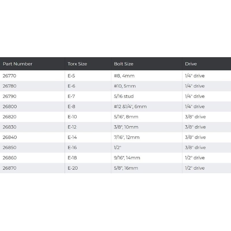 - The four smaller sizes are 1/4" drive; the next four sizes are 3/8" drive, the two largest sizes are 1/2" drive