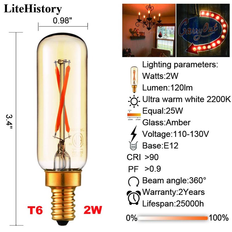 LiteHistory Dimmable T6 led Bulb 25W Candelabra led 2200K Amber 120lm 2W e12 T25 led Bulb 6Pack