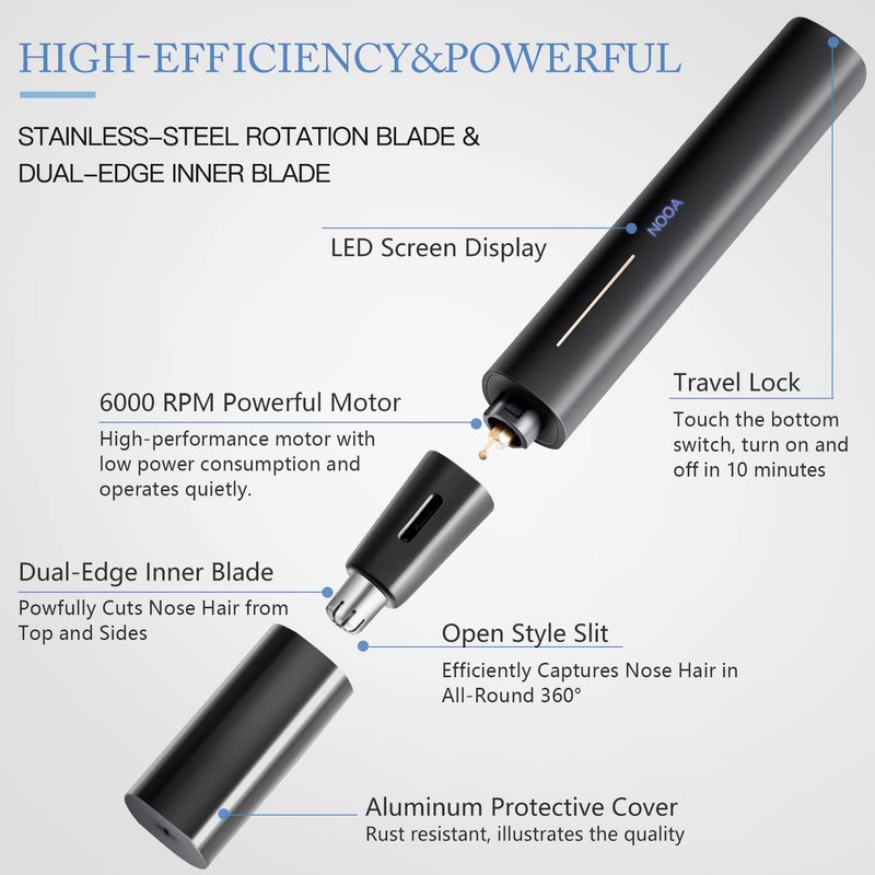 - UPGRADED PRECISION CUTTING SYSTEM: Built-in 3w powerful motor with less power comsuming by 8%, this cordless ear and nose trimmer with mute design has inner 360°rotating design with rustproof lightweight protective cover. Sharp dual-edge blades and high speed 6000RPM provides a smooth trim without pulling, making it ideal for those with sensitive skin.