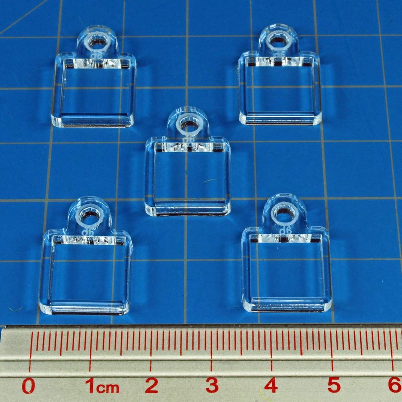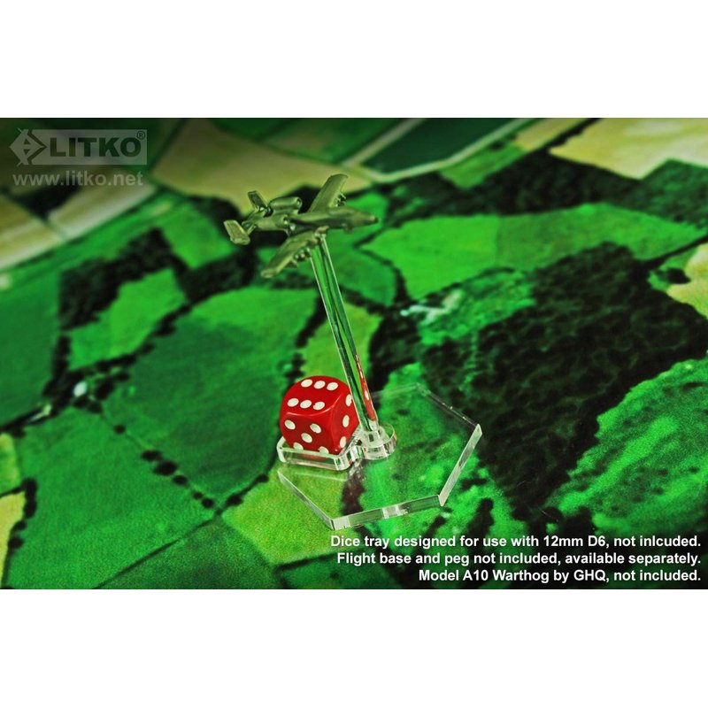 Designed to fit LITKO standard 3mm acrylic flight pegs and bases. Use these dice trays to add a 12mm D6 die to your flight stand to track elevation, fuel, speed or any other measure where a numbered die can be used. Slide it down the standard 3mm acrylic peg and glue to the flight base. We recommend you use 1.375 inch or 40mm bases or larger with these accessories. Flight stands, dice, and pegs sold separately. The sample displayed is our stock 1.375-inch flight stand. This part is compatible with our line of standard flight pegs. Requires glue to mount your miniatures. We recommend our Craftics #33 cement for all our acrylic parts.