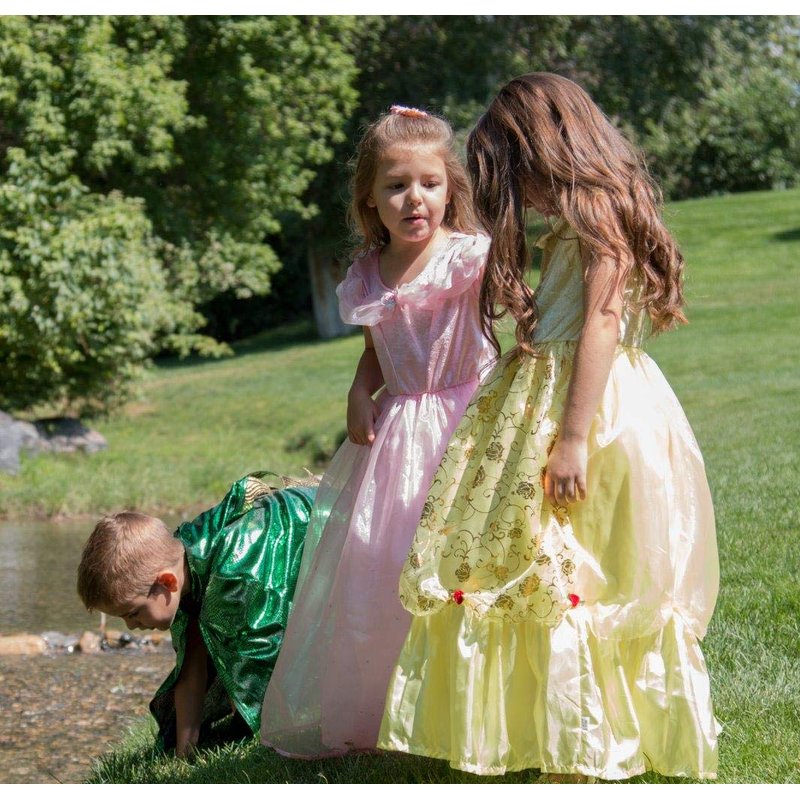 Your little girl will be as beautiful as a rose in this newly re-designed delicate yellow dress. Made with soft yellow velvet, the bodice of the dress is centered with a red rose and edged with a shiny gold trim. The fluffy organza skirt is tucked up delicately with soft red roses and trimmed with gold sequin. Features: Clothing quality fabrics; machine washable: Stretchy, soft and very comfortable. COMFORTABLE - WASHABLE - EVERYDAY PRINCESSES - BECAUSE CHILDHOOD IS AN ADVENTURE!!! Do you have a TRADITIONAL princess that loves tea parties, dancing, baby dolls and wearing princess dresses, but can't stand the itchy, uncomfortable fabrics or seams? Or is your princess the INDUSTRIAL type - preferring water fights to tea parties, running over walking, and living in their dress ups, but can outplay any princess dresses available? Then Little Adventures is your answer. Designed by two moms, Jenny and Heather, with little prince & princesses of their owns - Little Adventures products are DRESS UPS MADE FOR EVERYDAY PLAY! Heather and Jenny were frustrated with the fact that dress ups couldn’t be washed. The fabrics would fall apart in the washing machine and many were made to be dry-cleaned only, an absolutely absurd idea for a practical mom. They knew there had to be a better way! So Little Adventures began! MACHINE WASHABLE All Little Adventures Dress -Ups and costumes are durable and machine washable. Messes from an outdoor picnic, jumping in puddles, or every day play? No Problem! Just toss in the wash, dry and you're good to go again. Let the adventures begin! See sizing chart in images. (Additional accessories sold separately.)