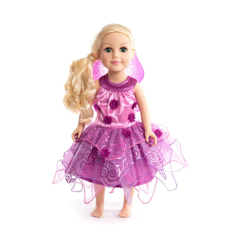 This Purple Blossom Fairy doll dress with wings will transform your child's doll into a magical fairy! This design features clothing quality stretchy fabrics, is machine washable and fastens with a hook and loop closure. It’s made to fit 16"-20" dolls and plush animals, including American Girl and Madame Alexander dolls. Doll or plush not included. Features: Clothing quality fabrics; machine washable. Stretchy fabrics with hook and loop closures. Little Adventures products are safety tested to meet all physical, mechanical and flammability requirements.DOLL DRESS ONLY. DOLL CROWN, DOLL, ARE NOT INCLUDED