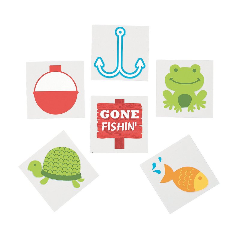 - Kids love temporary tattoos, and our Little Fisherman Tattoos are party favors that are guaranteed to snag attention! Easy to apply and remove, entertain your little guests when you decorate them with anchors, fish, turtles and bobbers. These tattoos are also fun school carnival prizes and great alternatives to candy when you put them in goody bags! Safe and non-toxic. (6 dozen per unit) 1 1/2"
