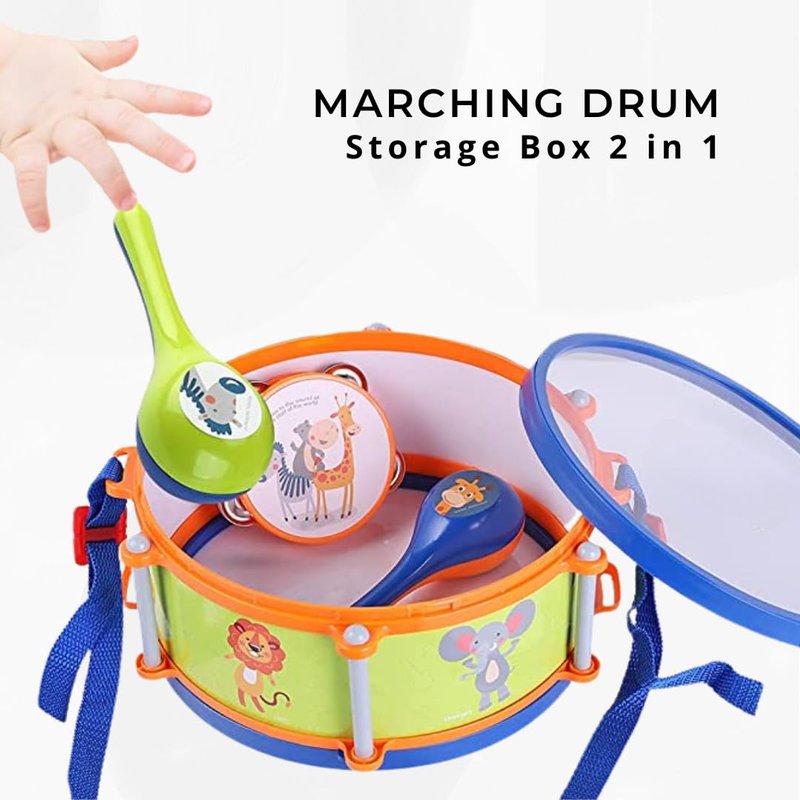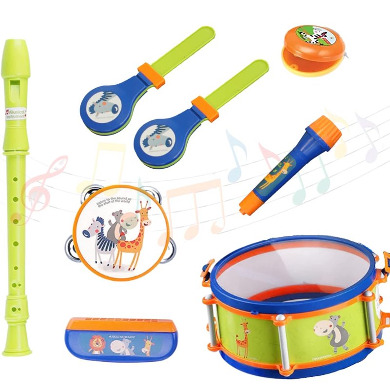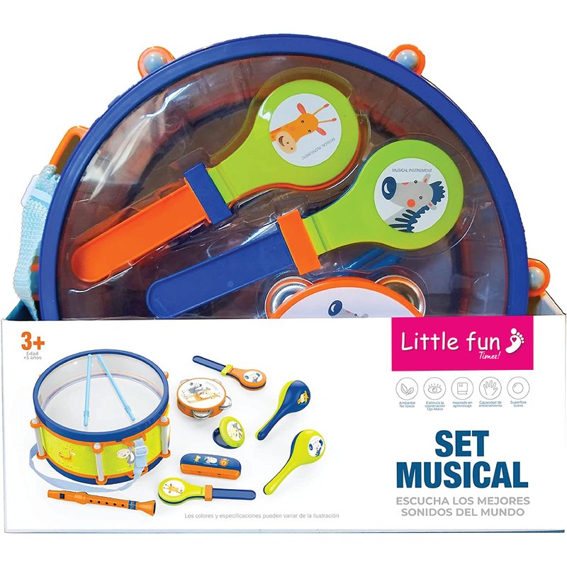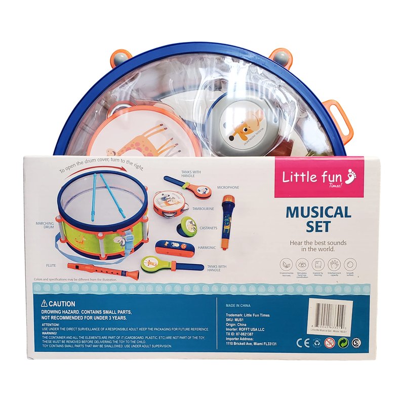 -PLAY AND LEARN WITH LITTLE FUN TIMES MUSIC INSTRUMENTS. INDOOR & OUTDOOR -The best collection of musical toys. the musical instrument set for children contains everything your little one needs to fell sound and music. -Educational musical toys: This musical set helps children develop fine motor skills and eye-hand coordination, as well as greater emotional understanding. They get fun and art at same time. -Guaranteed family fun with our musical set. Your child, no matter his or her age (this toy set is great -Easy to clean and store. The drum is at the same time the storage box for other instruments. So they do not get lost and occupy little space. Easy to move to play outside or inside the house. -Set includes: drum, palmetto, castanet, flute, chopsticks, harmonica, ribbon, tambourine, microphone