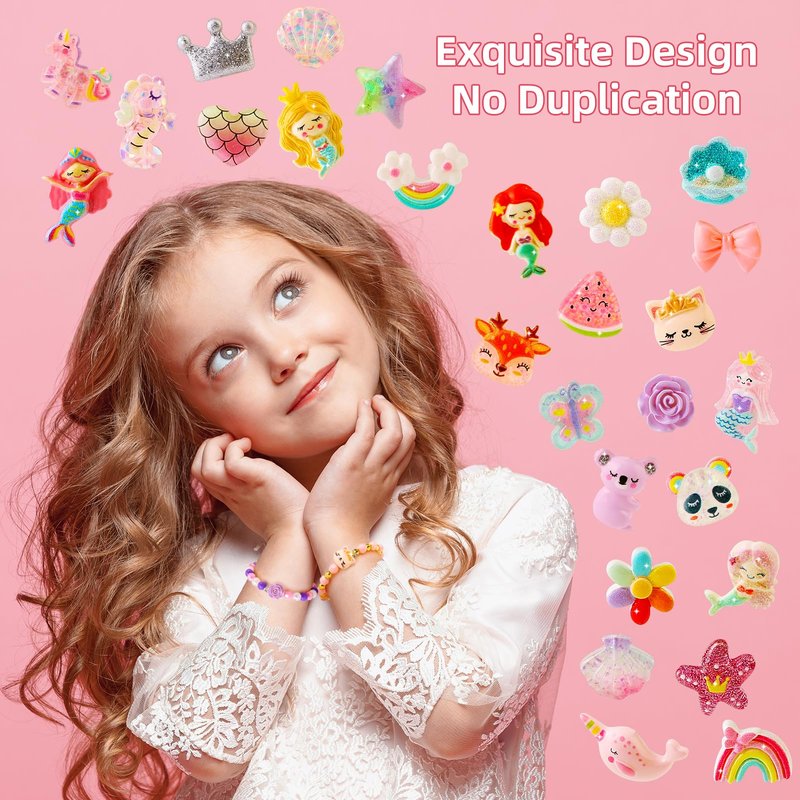 - MERMAID THEME: This Children's Jewelry Set is designed with the MERMAID that little girls dream of. Comes in a variety of styles with no repeats, including mermaid, rainbow, flower, butterfly and other elements for the little princess to decorate as she pleases.
