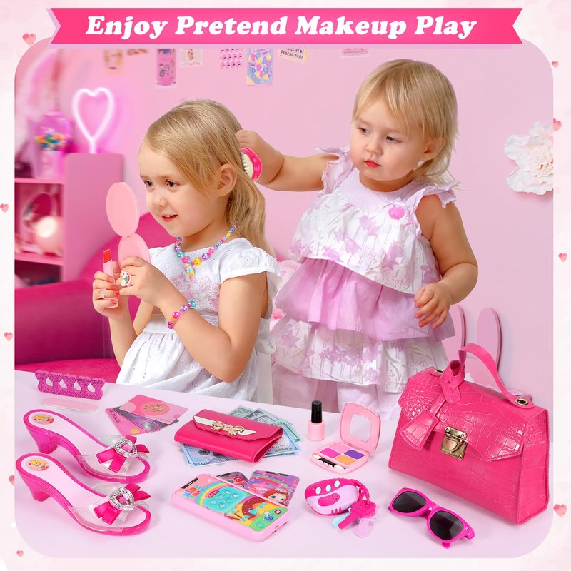- PRETEND MAKEUP FUN: Girls will love applying face powder with the applicator, bright lipstick, and eyeshadow every morning just like you, making themselves look very pretty. You don't have to worry about the mess. It's just for girls to play pretend makeup. All makeup accessories are made from non-toxic ABS plastic, with no terrible odors or sharp edges to ensure safety for your little princess. Enjoy endless fun with the kids' purse toys.