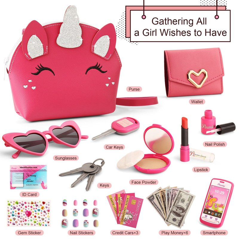 - Toddler Girl Play Purse Set: This toy purse for girls and toddlers age 3-5 4-6, includes everything a little girl needs for entertainment. It comes with an Unicorn Crossbody Purse, a Wallet, a Mobile Phone (no function), a Sunglasses, a Car Keys (no function), a Pretend Makeup Kit (Lipstick, Face Powder, and Nail Polish), 6 Play Money, 3 Unicorn Cards, an ID Card, a Gem Sticker, and a Nail Sticker Set. Your little one can pretend to apply makeup or go shopping just like mommy or enjoy role-playing!