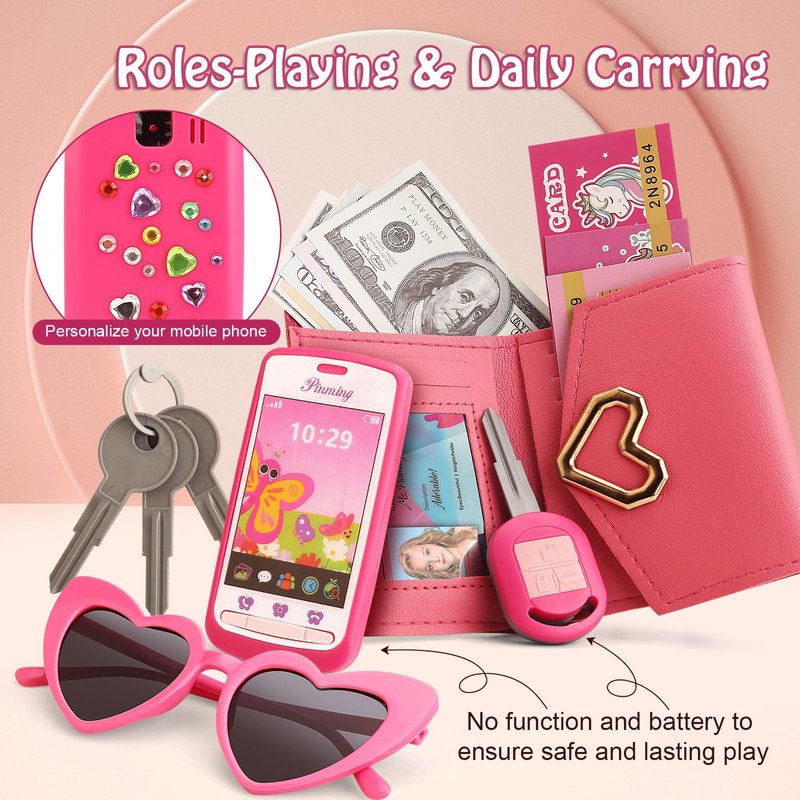 - Imagination and Imitation Skills: More than just a little girls toy age 4-5 6-8, this toddler pretend play purse helps develop your child's imagination and imitation skills. They can pretend to do everyday tasks like using a plastic key to open doors, calling friends, and shopping with play money.