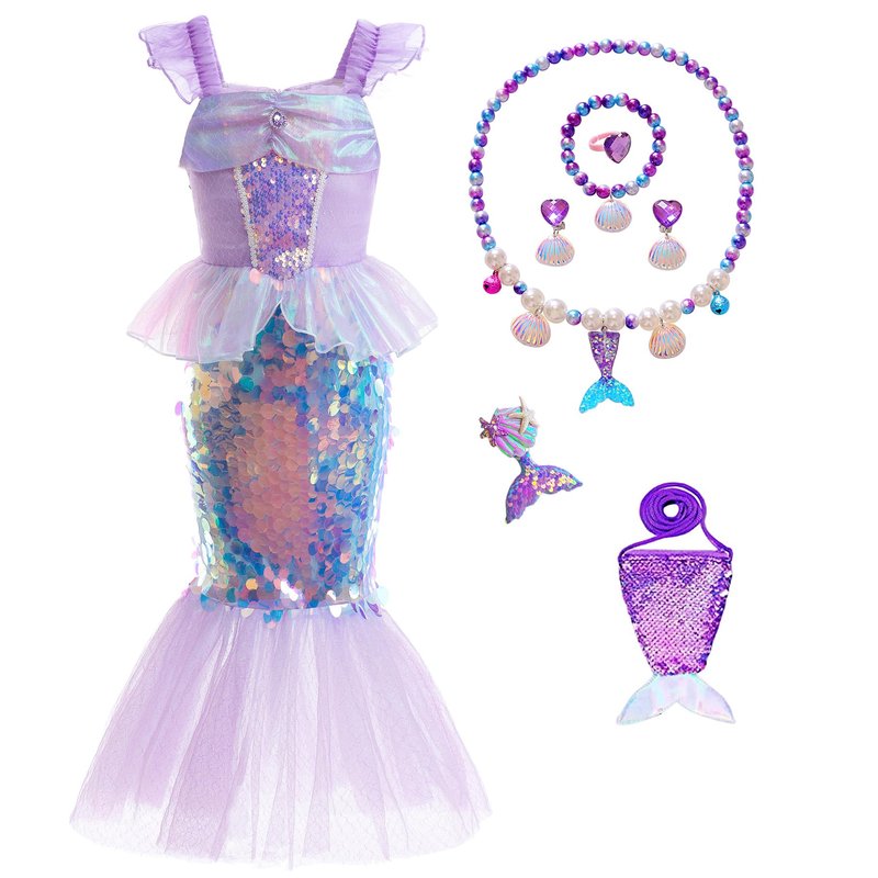 - Package Included: Mermaid Dress,Bracelet, Necklace, Princess Hair-brush, Earrings, Tale Coin Purse, Rings.