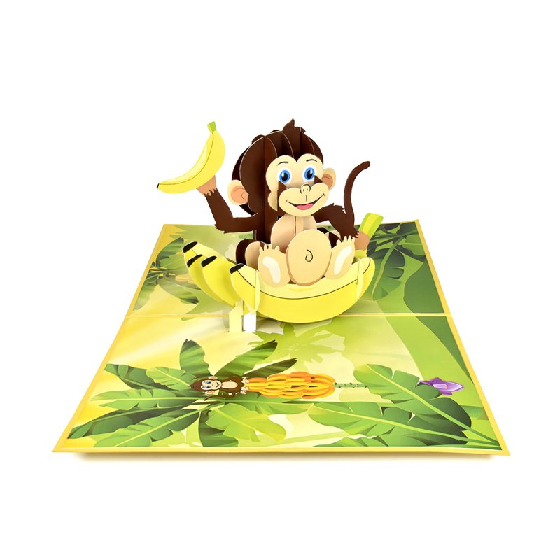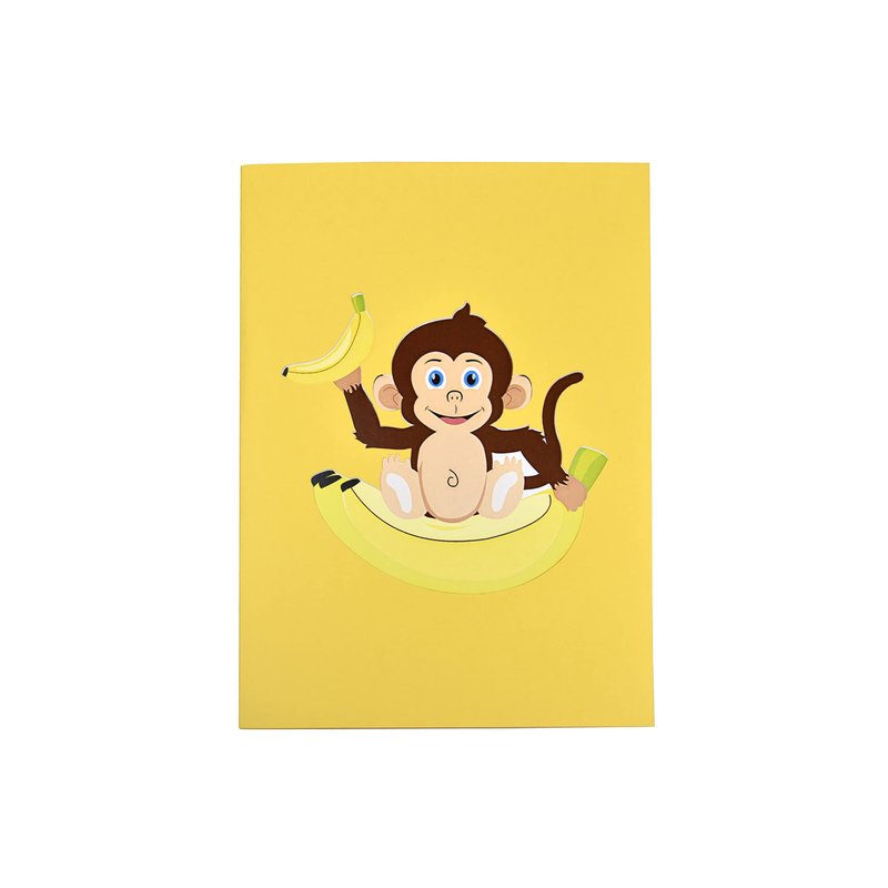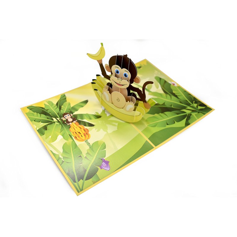 - This cute monkey pop up card is perfect for jungle and animal lovers! The 3d design is sure to make anyone smile, and the banana is a fun touch. This card is perfect for birthdays, kids, and anyone who loves monkeys!