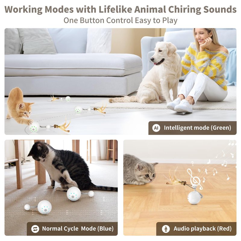 - [Intelligent Electric Cat Ball Toy] - The interactive cat toy ball with 3 modes to meet cats different personalities. Upon being turned on, This active rolling ball will have a “Meow” sound, then pressing 2 seconds to turn to Normal, Intelligent, Record Playback Mode. The toy ball is one button to control very easy to use. 360 degrees irregular movement trajectory, make your cats great daily fun.