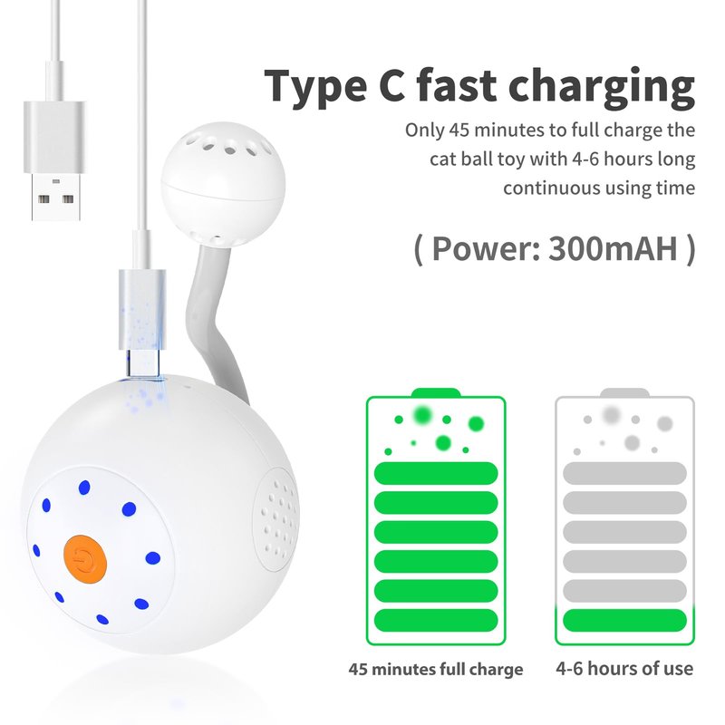 - [Fast Type C Charging] - Type C fast charge just 45 minutes the cat ball can be full charged. Provides your kitty up to 4-6 hours of fun time and comes with type C cable. No need to replace batteries, environmentally friendly and save money. The ball can run on any type of hard floor such as marble, wood, tils floor, thin carpet. The flashing LED color light will make the cat feel more interesting and bring more joy to your cat.