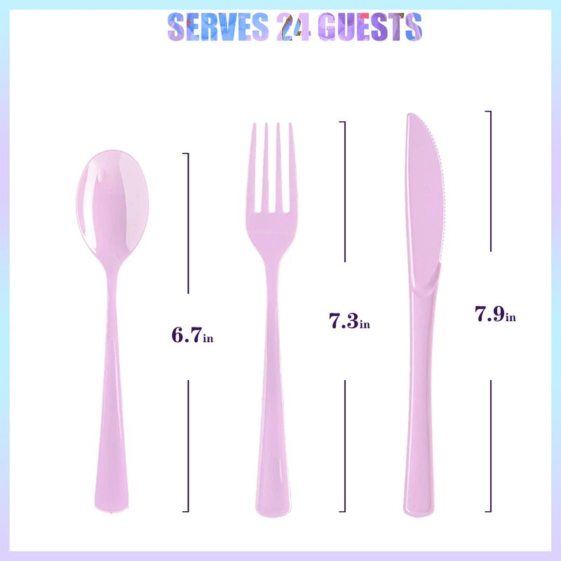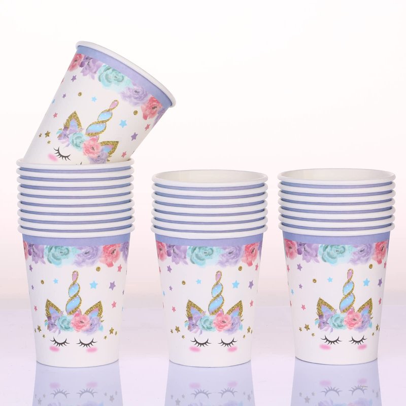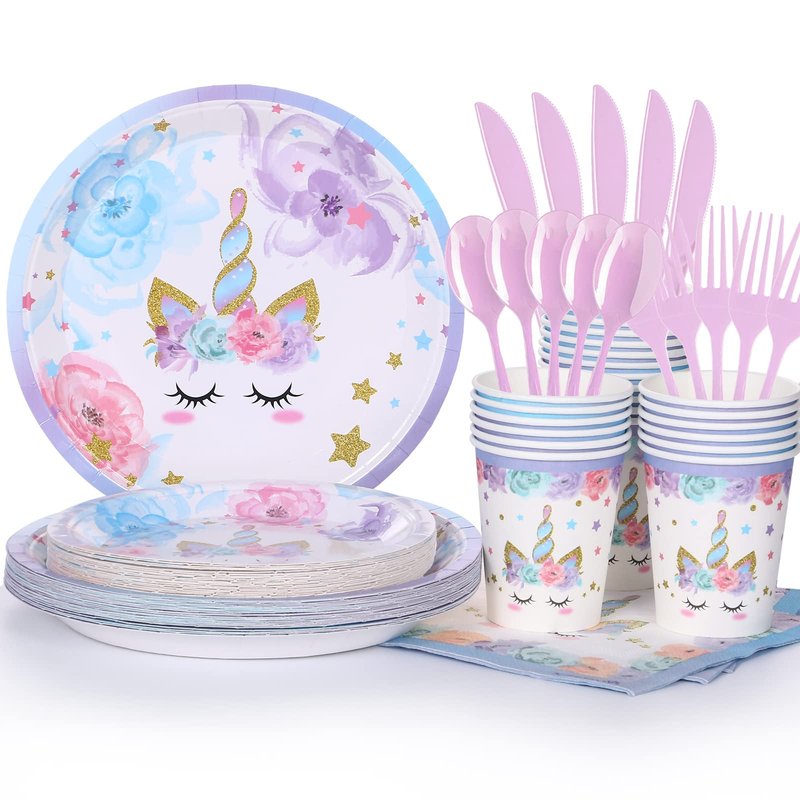 - ❤【unicorn party plates and napkins sets】The Unicorn party supplies set accommodates 24 guests. The disposable unicorn-themed tableware set includes two sizes of unicorn paper plates, 24 9-inch dinner plates and 24 7-inch dessert plates, 24 cups, 24 sets of napkins, 24 knives, 24 forks and 24 spoons. All you need is this complete set of unicorn party packages to make your little unicorn fan's big birthday celebration a huge success with a minimum of fuss.