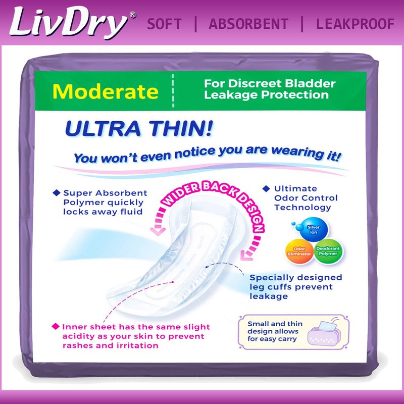 - ✔ ODOR CONTROL TECHNOLOGY - LivDry very thin pads are made with Silver Ion Technology to control the pad's odor and keep you feeling clean and fresh all day.