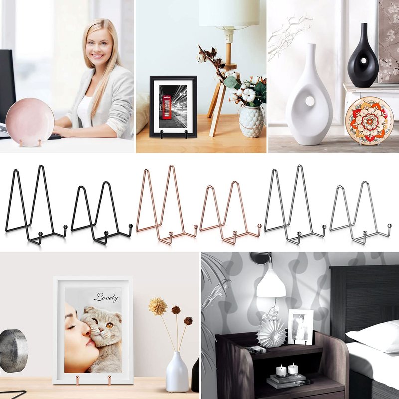 Livelab metal plate stands for display, picture, decorative plate, book, photo easel, artistic work simple iron design, decorate your table, perfect black matte powder-coated finish and electroplating (rose gold / silver) finish improve quality. Tailored for display your showpiece! In a simple and elegant way let you focus on your artwork rather than display holder.