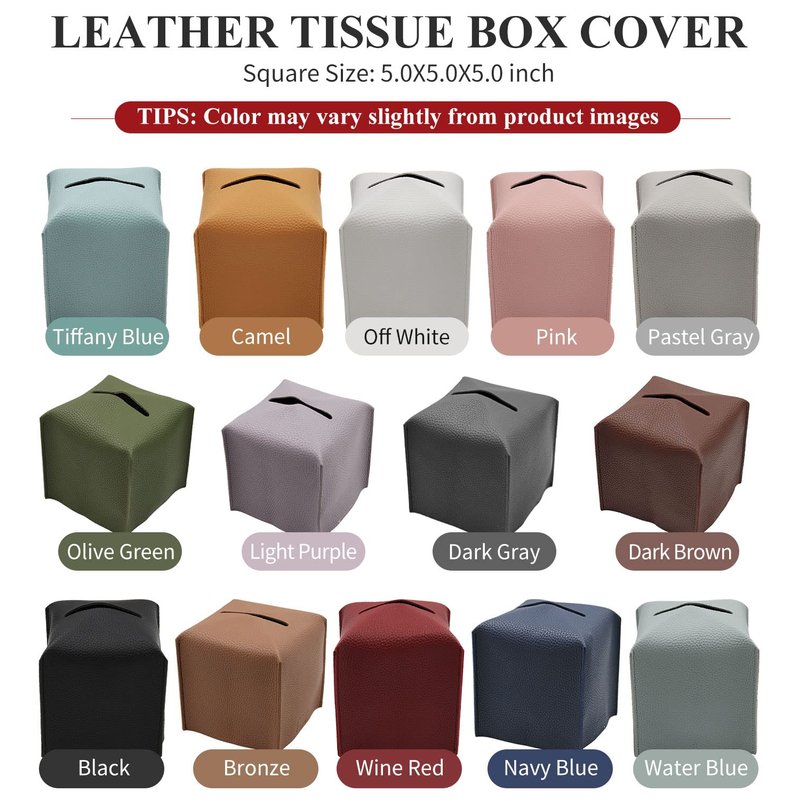 - WHAT YOU GET: High quality PU leather tissue box cover, with our 18-month worry-free and friendly customer service. It's a good gift for home, office, and car. Perfect for most tables, night stands, desktops, countertops in kitchen, vanities and desks, living room in your daily life. It is a great gift idea for housewarming, house decoration, etc.